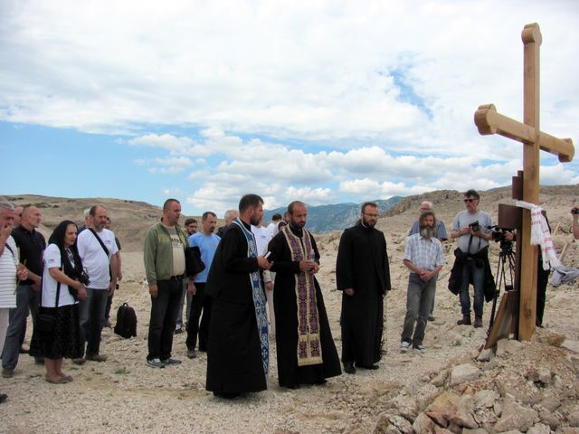 На платоу изнад увале Слана на острву Паг, подигнут дрвени спомен-крст и служен помен за више од 8.000 жртава, већином Срба, побијених у камењару и утопљених у мору Пашких врата.