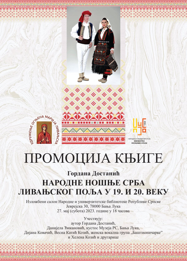 Књига НАРОДНЕ НОШЊЕ СРБА ЛИВАЊСКОГ ПОЉА У 19. И 20.ВЕКУ биће представљена бањалучкој публици, 27.маја т.г.(субота) у 18.часова у Изложбеном салону Народне и универзитетске библиотеке Републике Српске, Јеврејска 30, Бања Лука.